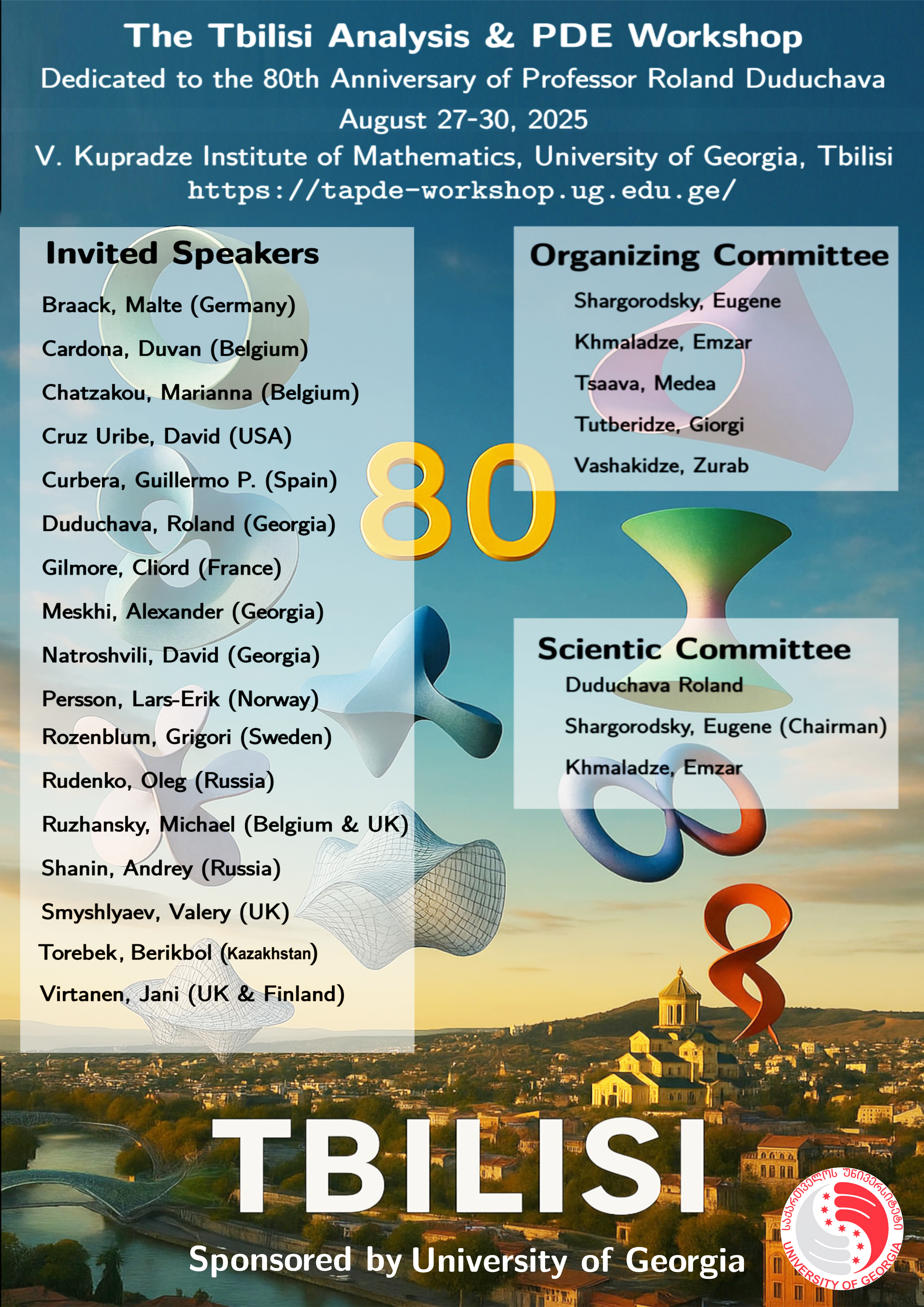 The Tbilisi Analysis & PDE Seminar (TAPDE) was founded in November 2020 as a bi-weekly series of online seminars, featuring presentations by over 60 distinguished scholars from many countries. The original plan to complement the online talks by an annual Workshop had to be put on hold due to COVID-19. We are delighted to be able to announce the launch of the 3-rd consecutive Tbilisi Analysis & PDE Workshop (TAPDE2025), which will take place in Tbilisi, the capital of Georgia.